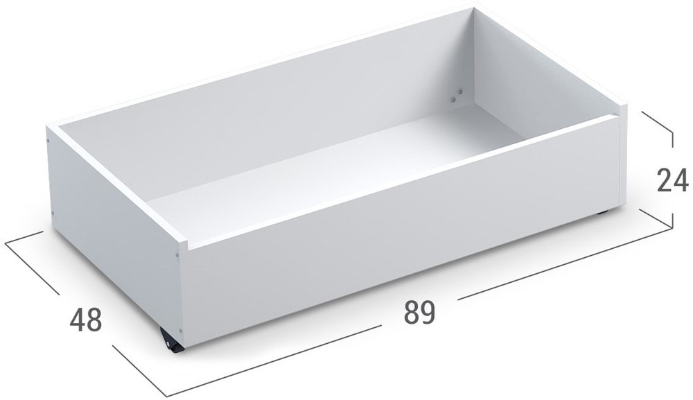 Короб выполнен из ламинированной ДСП и ДВП белого цвета. Короб установлен на роликовые опоры со специальным мягким покрытием, не оставляющим царапин на полу.