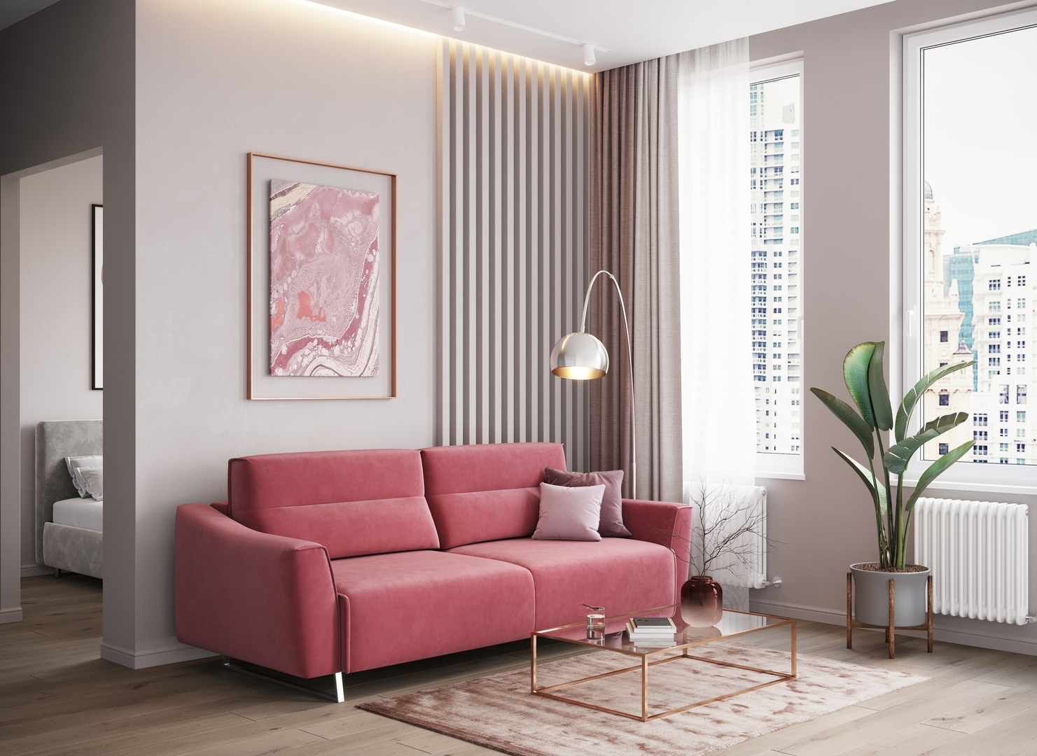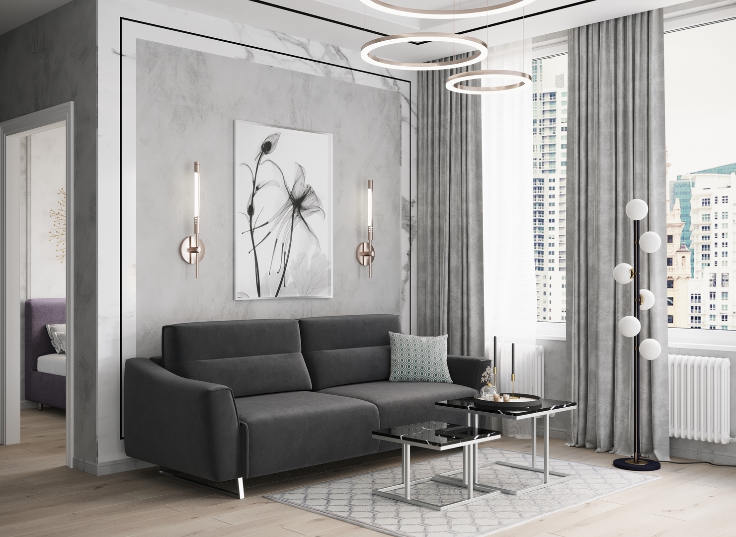 Декоративный кант, частично проходящий по элементам дивана, подчеркивает роскошь форм, усиливая эстетику образа.