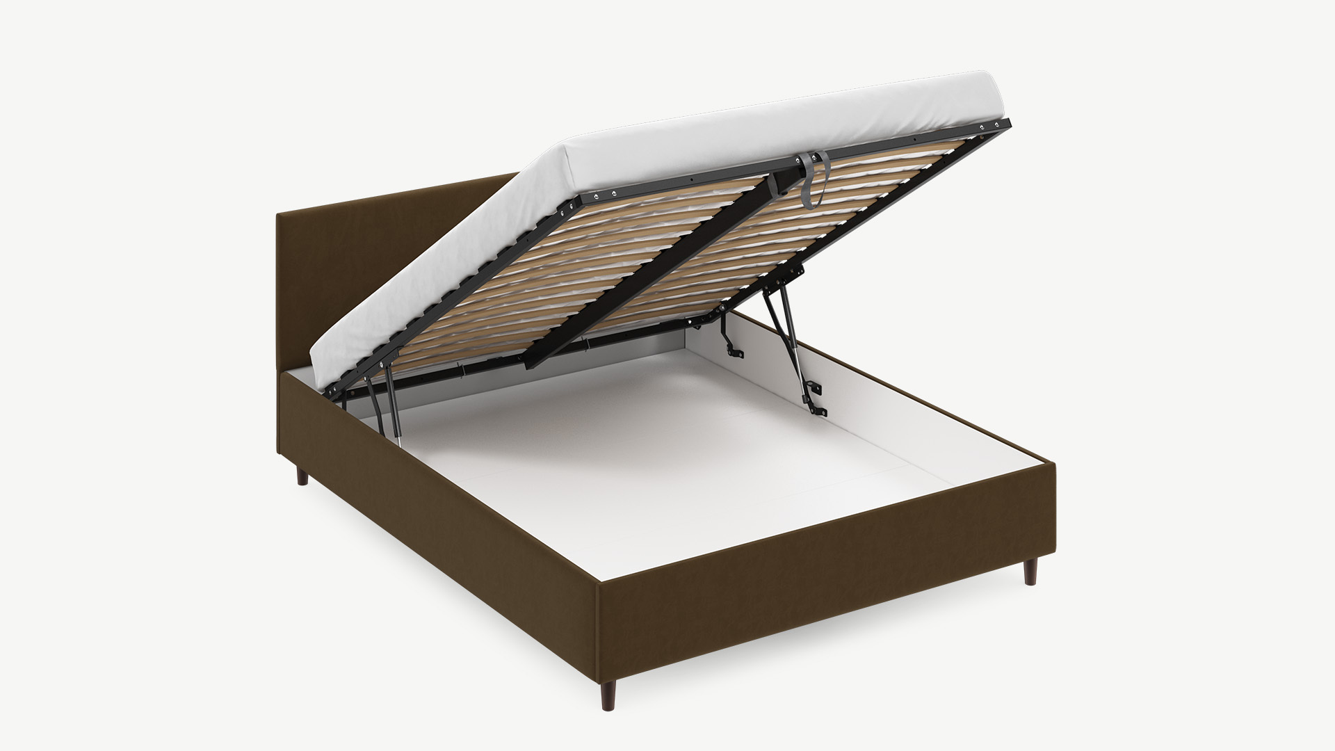 • Скрытая под основанием вместительная емкость без внутренних перегородок позволяет использовать всю площадь подкроватного пространства для хранения вещей.
