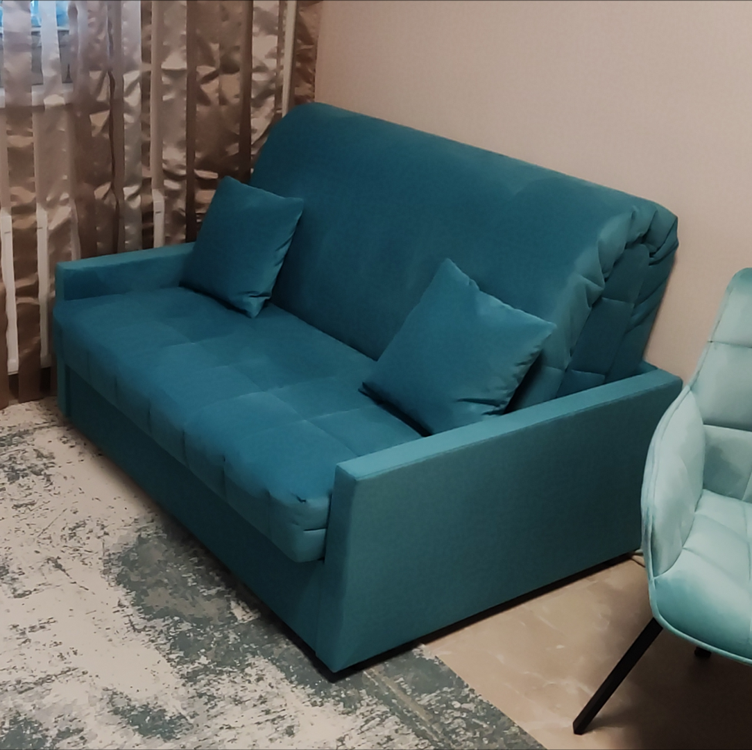 Диван выглядит круто. Классный бирюзовый цвет. Очень приятная ткань. Легко собирается и разбирается. Занимает мало места. Средней жёсткости. Две декоративные подушечки. Бесплатная доставка и сборка. Советую к покупке.