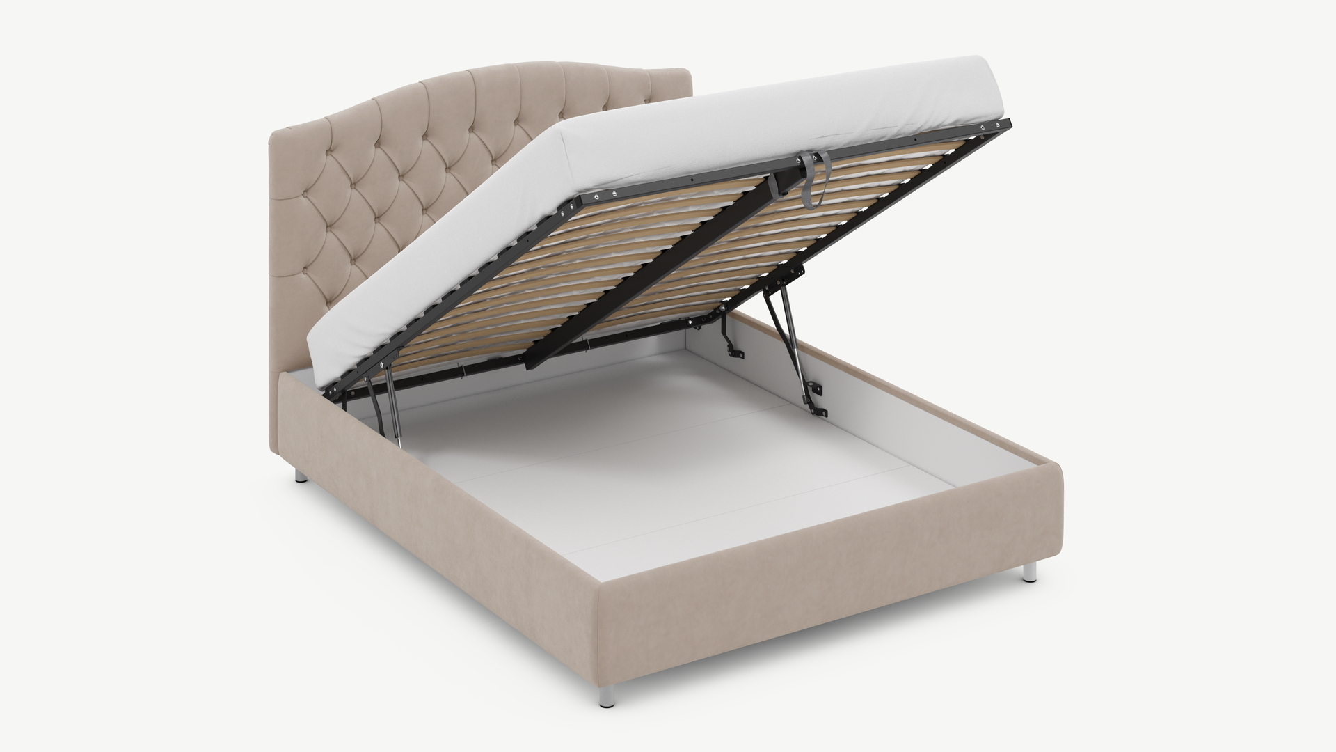• Скрытая под основанием вместительная емкость без внутренних перегородок позволяет использовать всю площадь подкроватного пространства для хранения вещей.