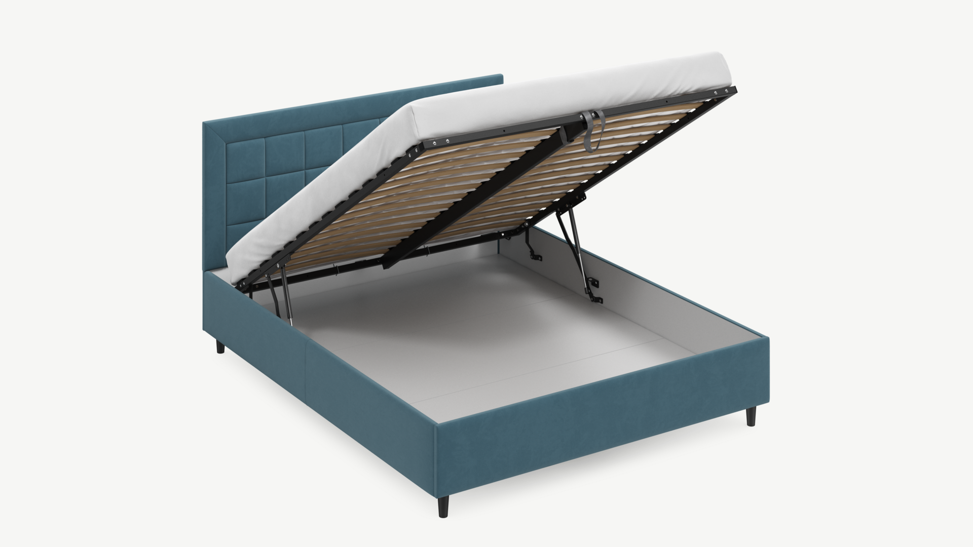 Вместительная емкость под кроватью без внутренних перегородок позволяет использовать для хранения вещей 100% пространства.