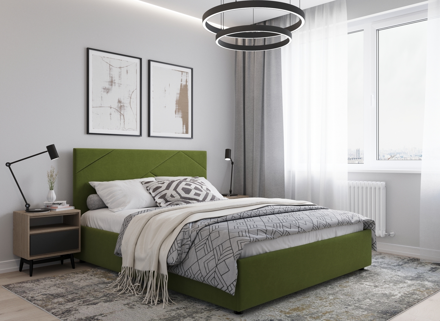MOON FAMILY 1257 привлекает внимание оригинальным исполнением: широкие полосы ткани эффектно пересекают периметр изголовья, создавая на нем графический орнамент. Элегантным и практичным акцентом служат скрытые карманы, расположенные по его углам. Лаконичные формы объемных царг создают единый гармоничный образ и фокусируют внимание на центральном текстурном элементе кровати.