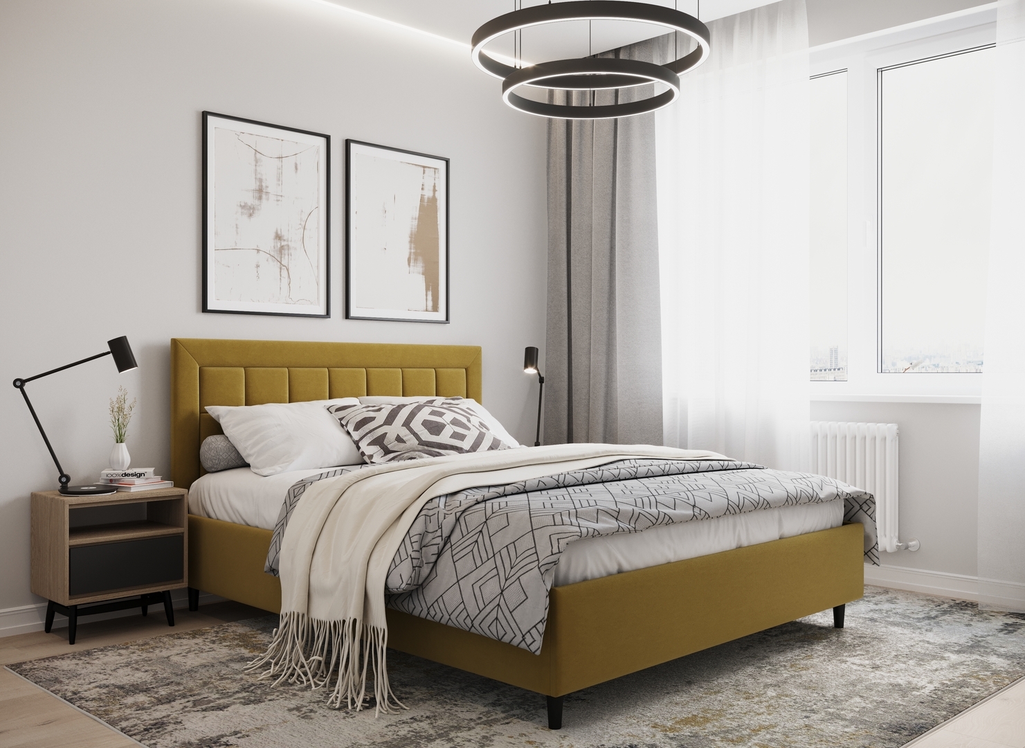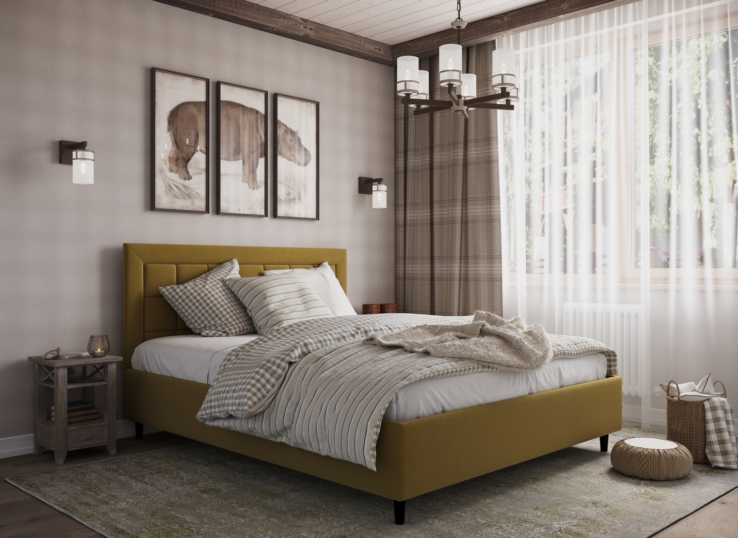 Стежка помещена в центр изголовья и обрамлена, словно картина. Объемные царги завершают цельную фигуру кровати и становятся гармоничным дополнением ее образа.