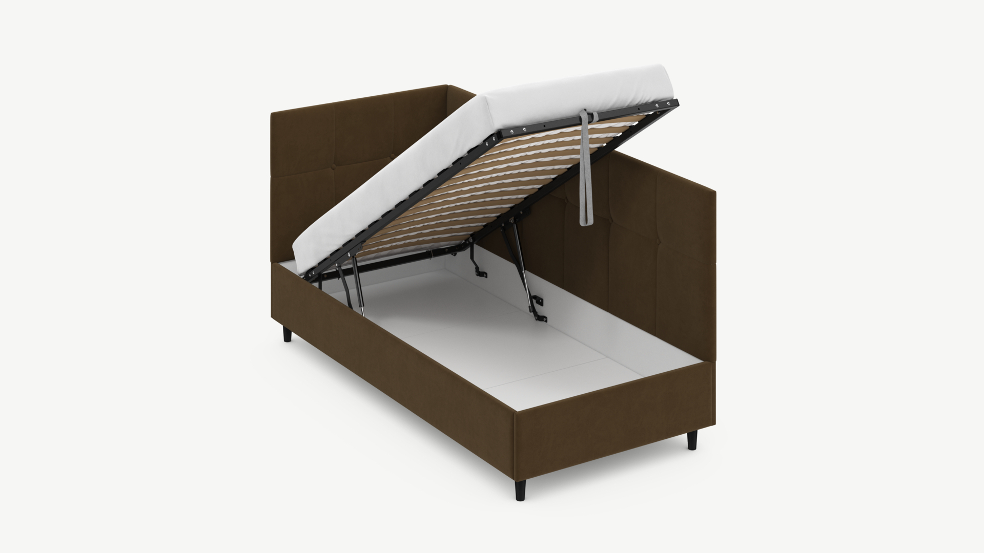 • Скрытая под основанием вместительная емкость без внутренних перегородок позволяет использовать всю площадь подкроватного пространства для хранения вещей.