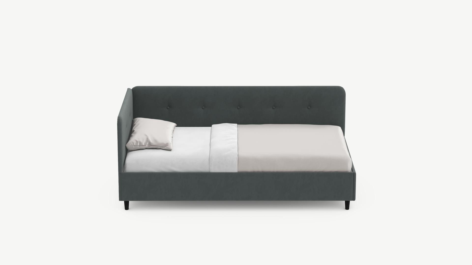 Угловая односпальная кровать MOON FAMILY 1253 с мягкой спинкой и изголовьем обладает округлыми формами, привносящими в интерьер нотки нежности. Изголовье, украшенное пуговицами, добавляет окружающему пространству шарм и уют. Высокие опоры придают кровати визуальной легкости, а также обеспечивают удобство во время уборки.