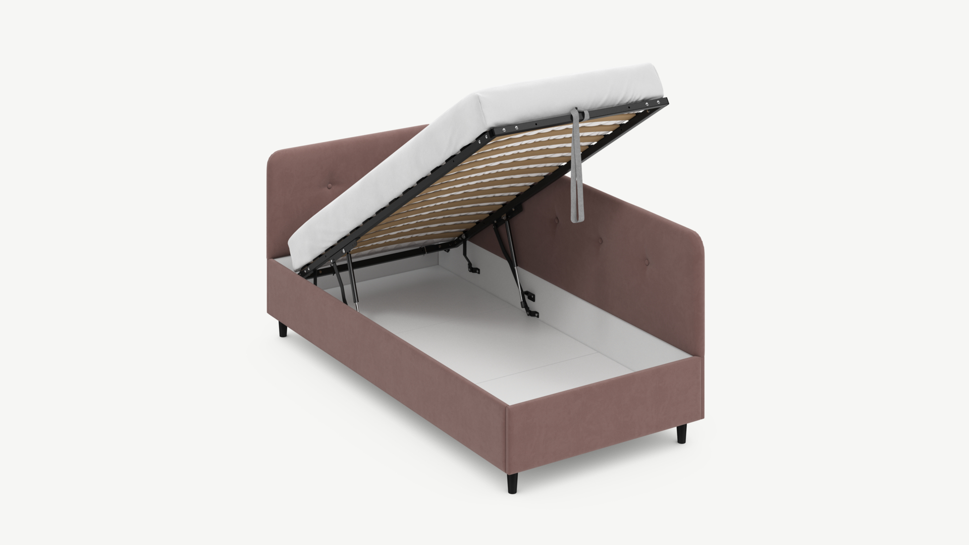 • Регулируемый подъемный механизм имеет два положения установки газовых амортизаторов в зависимости от веса матраса. Это дает возможность оптимально подстраивать угол подъема основания, а также плавно и бесшумно поднимать и опускать спальное место.