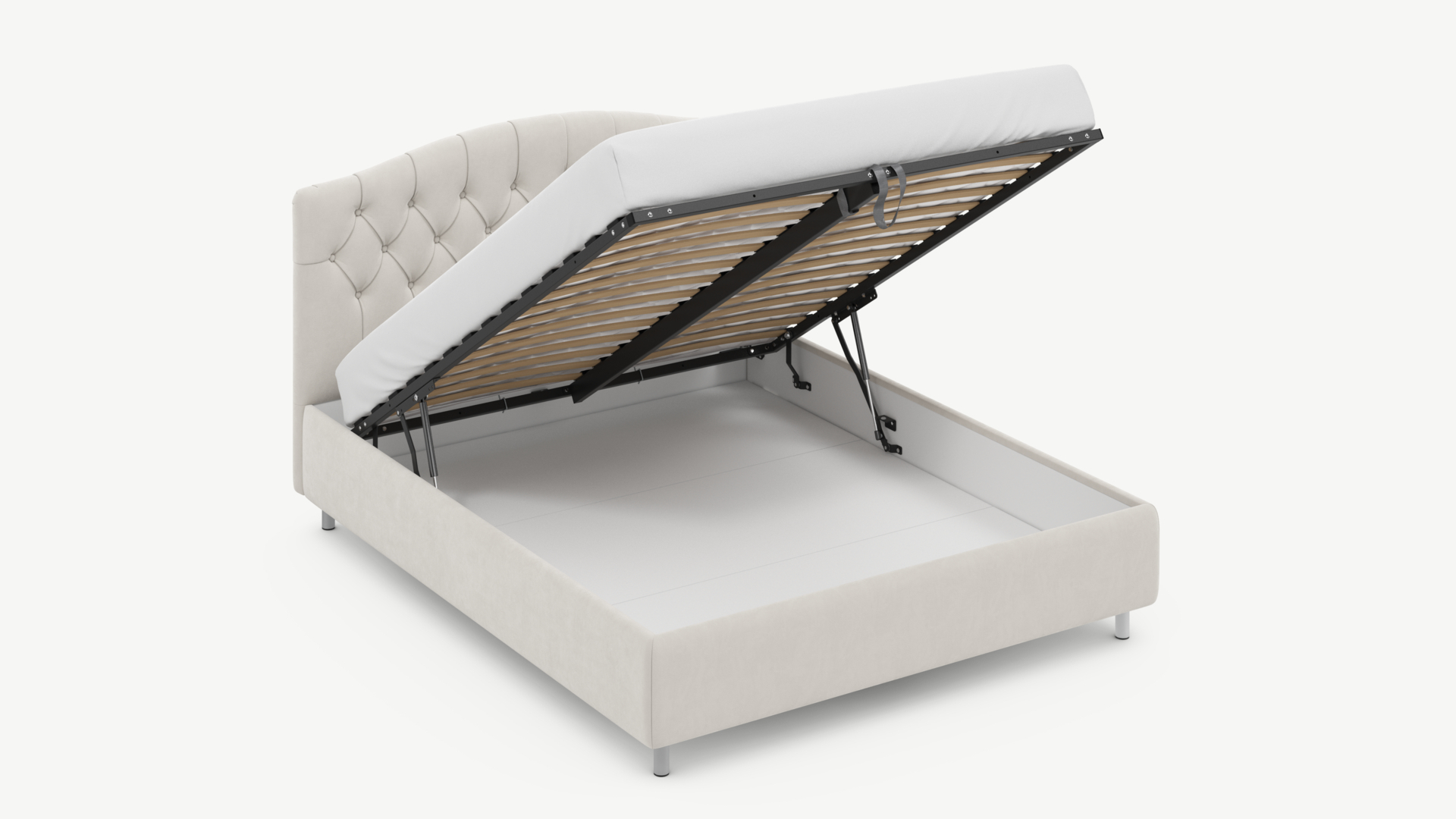 • Скрытая под основанием вместительная емкость без внутренних перегородок позволяет использовать всю площадь подкроватного пространства для хранения вещей.