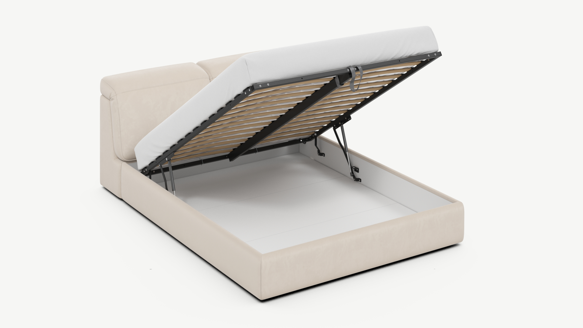 • Скрытая под основанием вместительная емкость без внутренних перегородок позволяет использовать всю площадь подкроватного пространства для хранения вещей.
